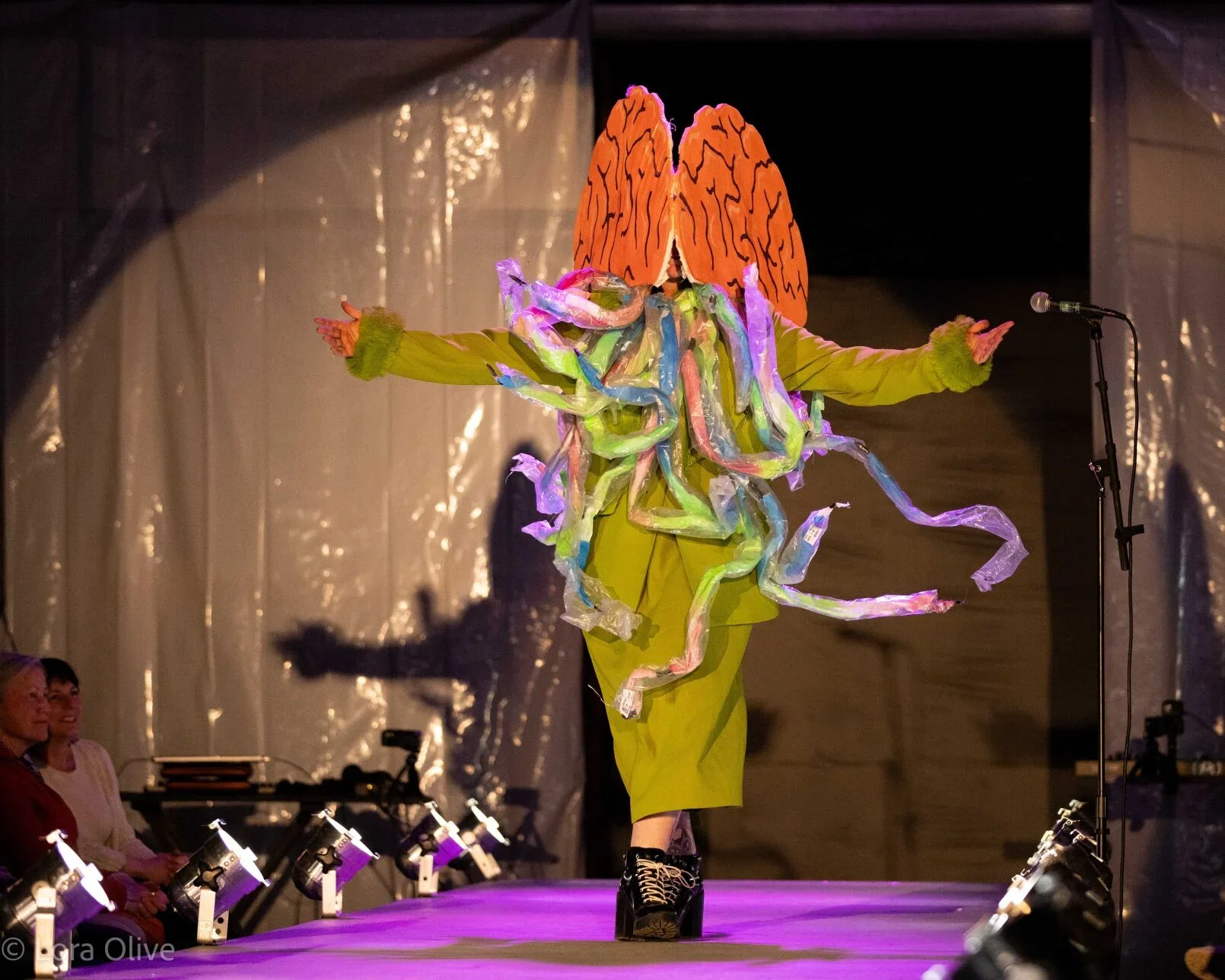 Lizzie performing at the Wearable Art Show at the Herron School of Art and Design Sculpture Building in 2024 in a costume she made